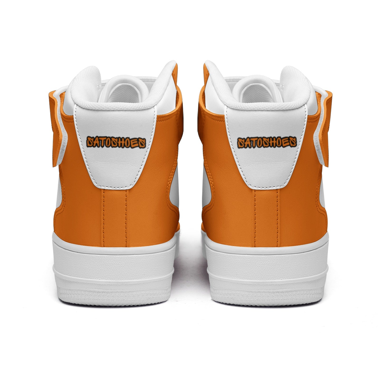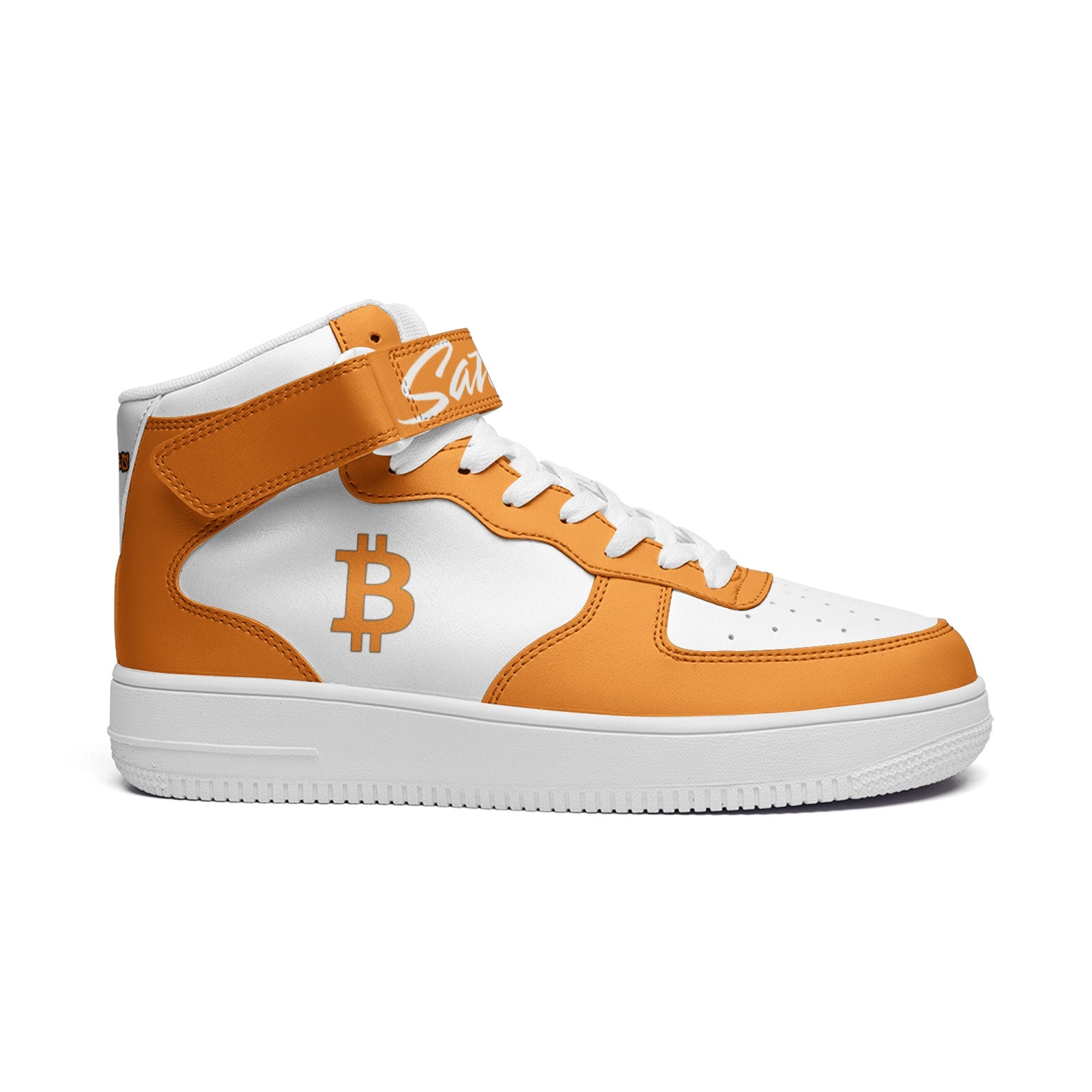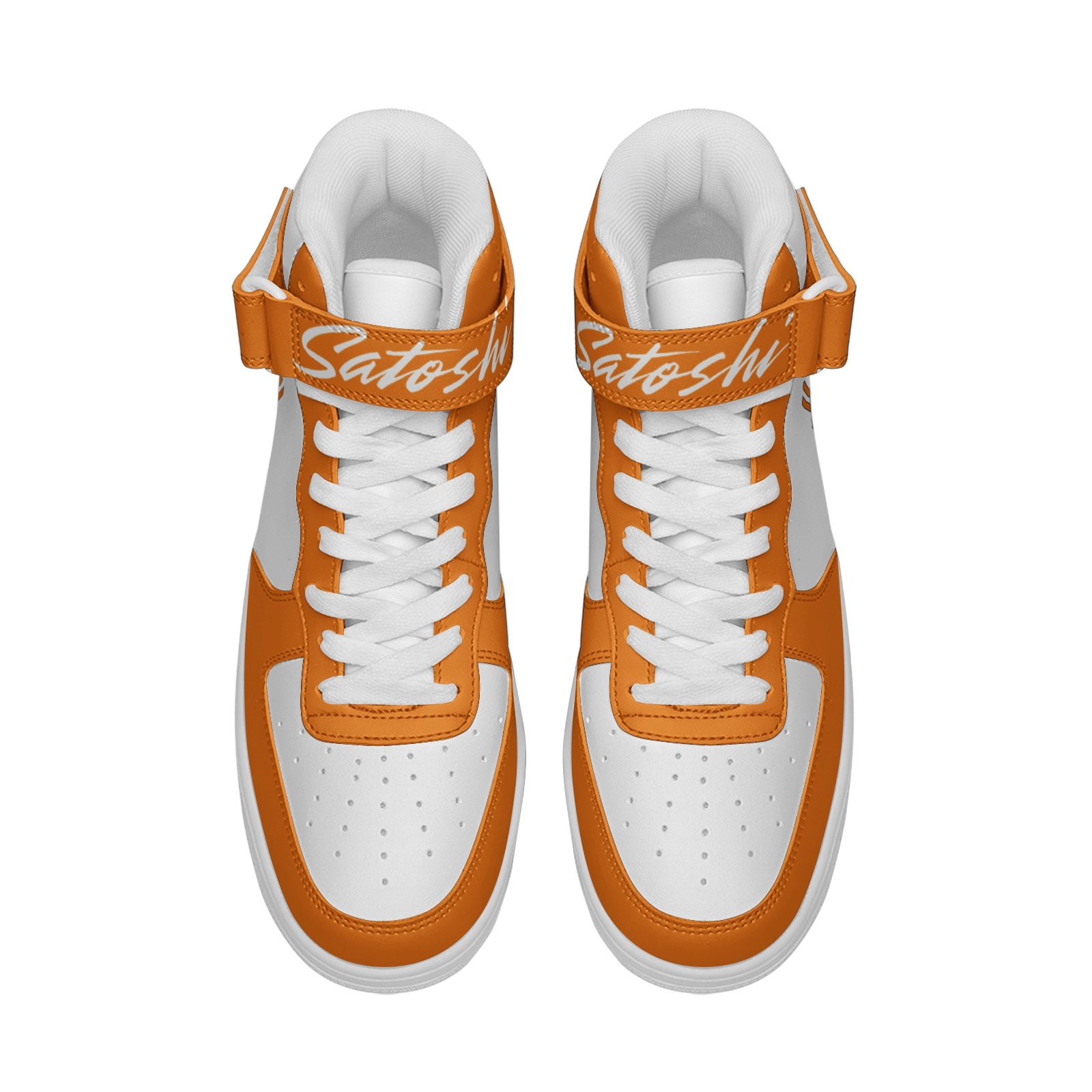 Our Bitcoin Orange and White High Tops. Inspiration taken from some Tron inspired pictures we created