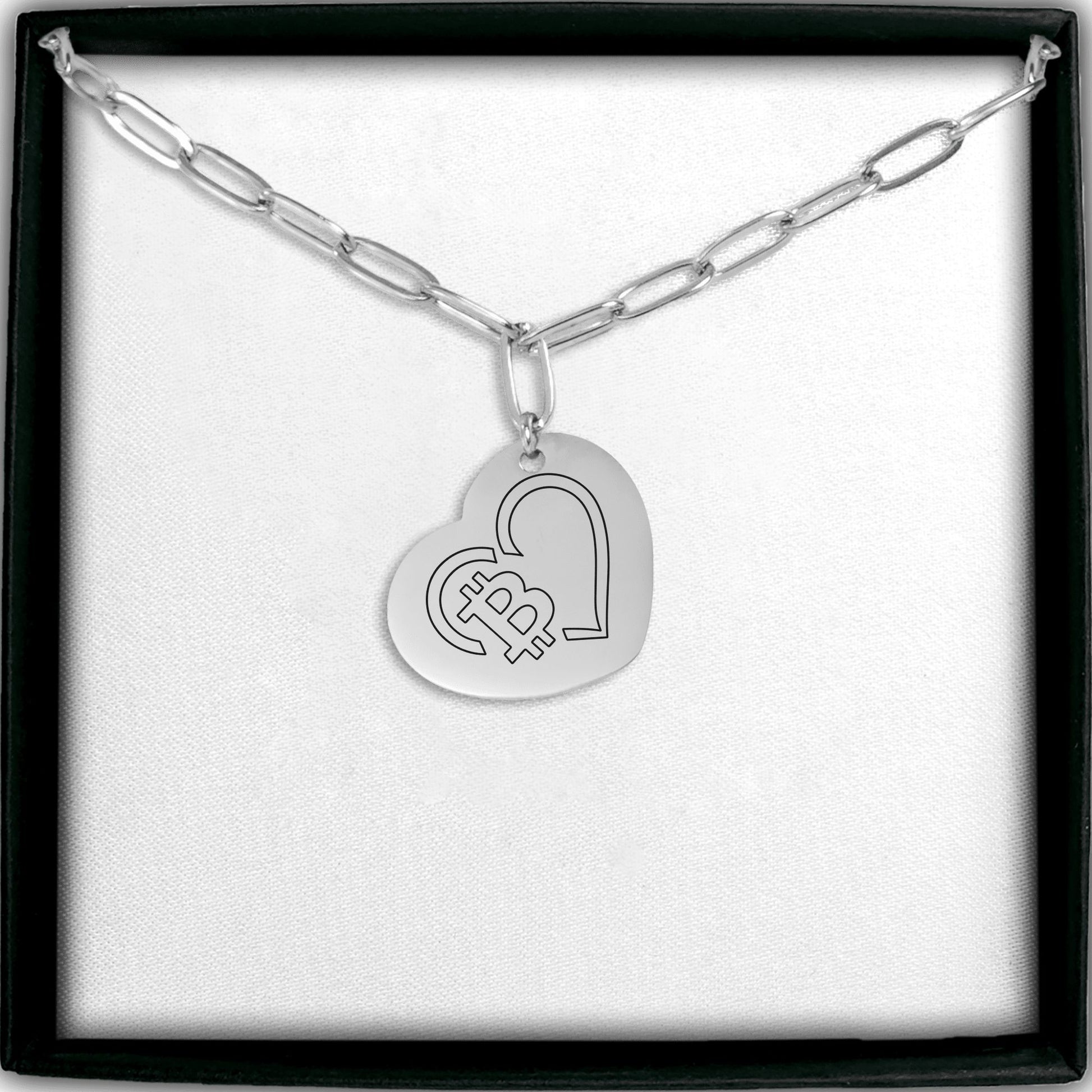 Paperclip Chain Bitcoin Heart Necklace Laser Engraved